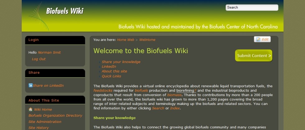 The open source site, which was initiated by the principal, provided useful content a broad range of visitors looking for information about industrial biotechnology, biomass crops, biofuels, bioproducts and bioplastics and related subject matter. It also had a section for company listings.